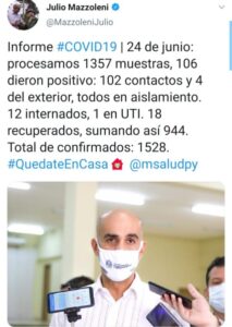El Ministro de Salud, Julio Mazzoleni, informó vía Twitter que en las últimas 24 horas se procesaron 1357 muestras: 106 dieron positivo, 102 contactos y 4 del exterior, todos en aislamientos.