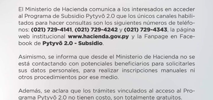 Nacionales 11 agosto 2020 por Francisco Insfrán · Published 11 agosto 2020 · Last modified 12 agosto 2020 Hacienda aclara canales habilitados para consultar sobre Pytyvõ 2.0