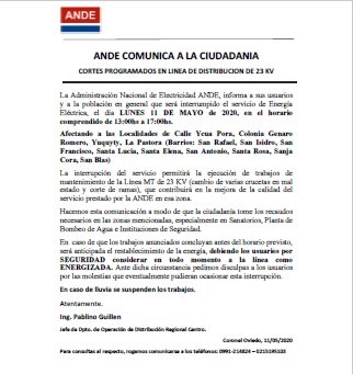 Locales / Regionales 11 mayo 2020 por Francisco Insfrán · Published 11 mayo 2020 · Last modified 12 mayo 2020 Atención: Zona de Genaro Romero y La Pastora estará sin energía eléctrica.