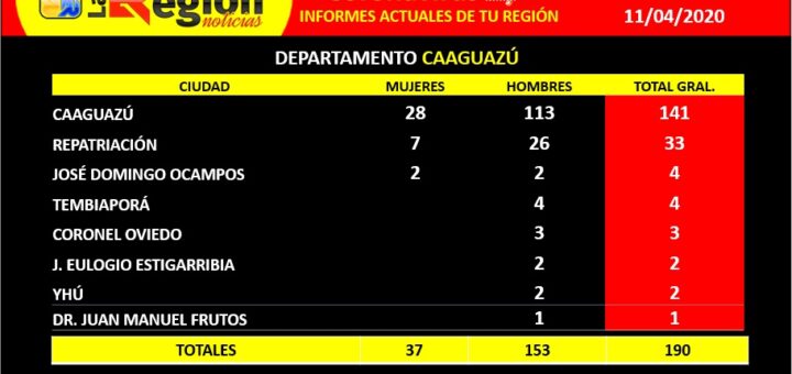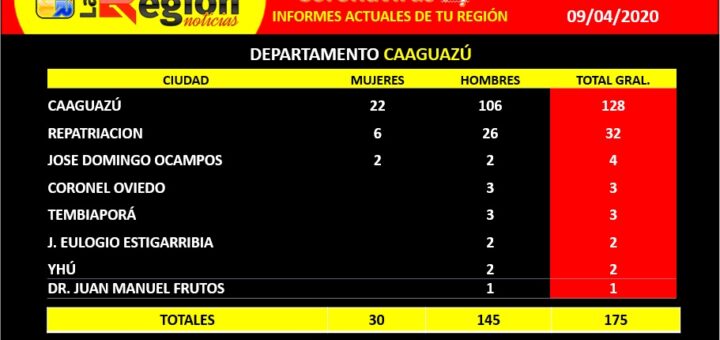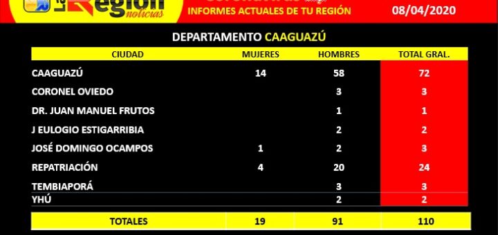 Locales / Regionales 10 mayo 2020 por Francisco Insfrán · Published 10 mayo 2020 · Last modified 12 mayo 2020 8 Nuevos casos en el departamento de Caaguazú