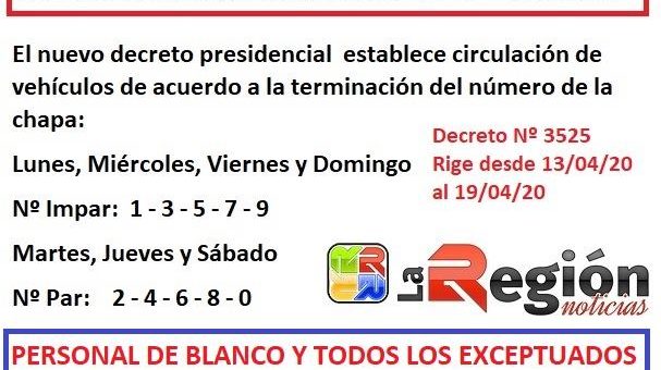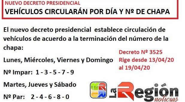 Locales / Nacionales / Regionales 9 abril 2020 por Francisco Insfrán · Published 9 abril 2020 · Last modified 13 abril 2020 Vehículos circularan por día y número de chapa