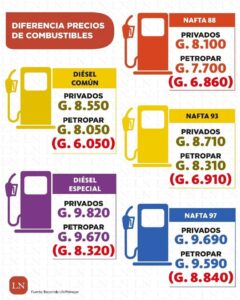 En la imagen se puede ver los precios de las expendedoras privadas y la de Petropar y más abajo en rojo, sería los precios anteriores.