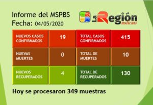 El Ministerio de Salud confirmó en la tarde de este lunes, 19 nuevos casos confirmados Suman a 415 el total de infectados por Covid-19 y sumados los 4 nuevos, recuperados llegan a 130