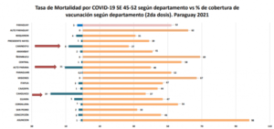 En contrapartida, los departamentos que cuentan con 60% o más de cobertura en vacunación y aunque tengan más casos positivos de la enfermedad, la mortalidad es menor. Ese es el caso de Asunción, cuya tasa de vacunados llega al 98%.