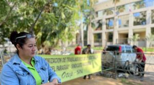 Con pancartas y banderas se encuentran frente al Congreso los miembros de la Organización de Trabajadores y Educadores del Paraguay, en protesta contra el proyecto de ley que establece penas de hasta seis años de cárcel por cierres de ruta.