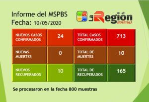 Hoy procesaron otras 800 muestras, los resultados son 24 positivos: 22 del exterior (procedentes del Brasil, en cuarentena obligatoria en albergues) y 2 sin nexo. 9 internados. 10 recuperados, sumando 165. Total confirmados: 713