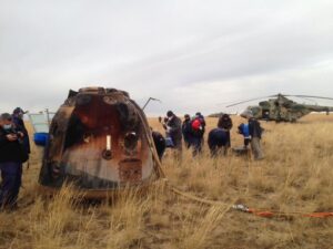 La cápsula de descenso tocó Tierra a las 2.54 GMT a unos 150 kilómetros al sureste de la ciudad kazaja de Zhezkazgán con los cosmonautas Anatoli Ivanishin e Iván Vágner y el astronauta de la NASA Chris Cassidy a bordo.
