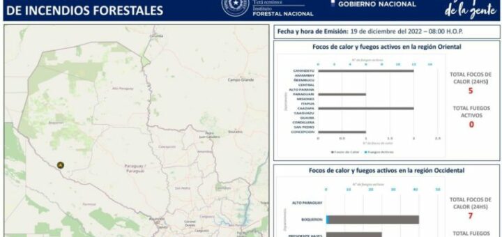 Nacionales 19 diciembre 2022 por Francisco Insfrán · Published 19 diciembre 2022 Reportan 12 focos de calor a nivel país: riesgo de incendios forestales es bajo
