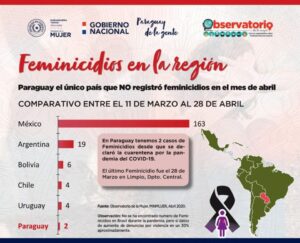 De acuerdo al monitoreo realizado por la Dirección General del Observatorio de la Mujer de la cartera de la Mujer, se sigue con menor número de víctimas de violencia extrema o feminicidios en el Paraguay, en este primer trimestre y hasta la fecha, en comparación al año 2019, y resaltando que estas cifras son a pesar del confinamiento obligatorio a causa de la pandemia.