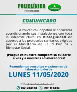 La Coopafiol Ltda. comunica a sus asociados y clientes que la Policlínica Coopafiol (TODEMCOOP) se encuentra acondicionando sus instalaciones con toda la infraestructura de bioseguridad de acuerdo a los protocolos sanitarios exigidos por el MSPBS.