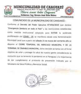 A través de un comunicado publicado en su página oficial el intendente de la ciudad de Caaguazú hizo conocer la medida tomada por su administración con respecto al cierre temporal del mercado municipal y la terminal de ómnibus para seguir adelante con la campaña de prevención y evitar contagios por la pandemia del Coronavirus que afecta al país y al mundo.