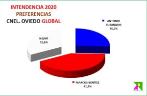 Según esta encuesta Marcos Benítez de (Jóvenes al Poder) sería el ganador con el 41,9 %, y el perdedor sería Antonio Buzarquis con el 25,5 %, quedando una alta franja de indecisos del 32% obviamente normal por la lejanía de las generales y porque solo es una suposición si solo quedaran ambos. El peso de la muestra favorece a los colorados, no obstante si hoy fueran las elecciones Marcos Benítez sería el intendente de Cnel. Oviedo tal vez por un margen más estrecho, pero como se sabe una encuesta es la fotografía del momento.