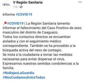 La V Región Sanitaria lamentó informar a través de su cuenta oficial que el fallecimiento del Caso Positivo de sexo masculino es del distrito de Caaguazú.