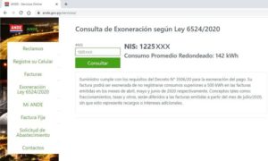 En la pestaña de servicios de la página web www.ande.gov.py se encuentra disponible una herramienta de cálculo que permite al usuario verificar si reúne las condiciones para la exoneración del pago de las próximas facturas de abril, mayo y junio. Se ingresa el número de NIS y la aplicación web calcula automáticamente el suministro promedio e informa si cumple con los requisitos del Decreto Presidencial N° 3.506/20.